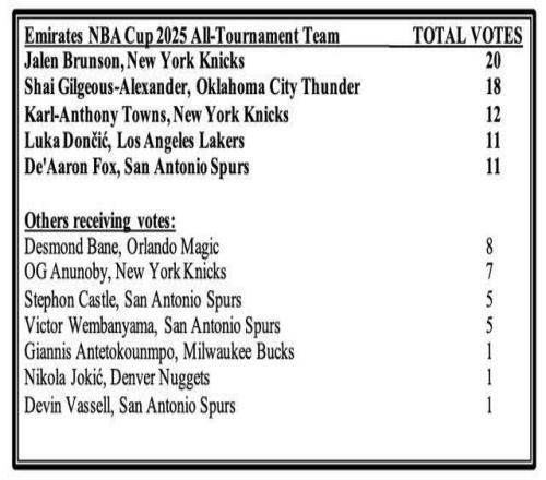 荣膺NBA杯MVP的布伦森最终收获20票全票入选,亚历山大收获18票,唐斯收获12票,东契奇与福克斯分别收获11票。