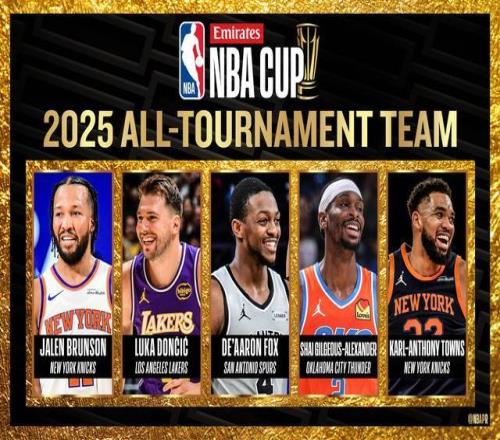 北京时间12月19日,NBA正式公布2025-26赛季NBA杯最佳阵容,纽约尼克斯的杰伦-布伦森、洛杉矶湖人的卢卡-东契奇、圣安东尼奥马刺的达龙-福克斯、俄克拉荷马雷霆的谢伊-吉尔杰斯-亚历山大与纽约尼克斯的卡尔-安东尼-唐斯联袂入选。