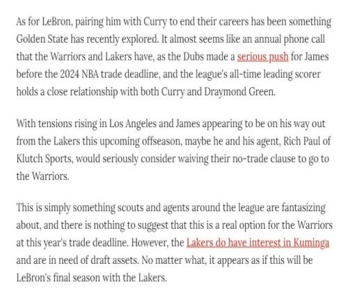 另外一位NBA记者布雷特·西格尔猜测勇士会继续追求詹姆斯,或许詹姆斯和库里会联手。西格尔提到,勇士和湖人每年都会进行例行通话,勇士曾在2024年交易截止日前全力追求詹姆斯,而这詹姆斯与库里和德雷蒙德·格林都保持着密切关系。随着湖人内部紧张局势升级,詹姆斯似乎已注定将在即将到来的休赛期离开湖人,或许他和他的经纪人会认真考虑放弃交易否决权加盟勇士。